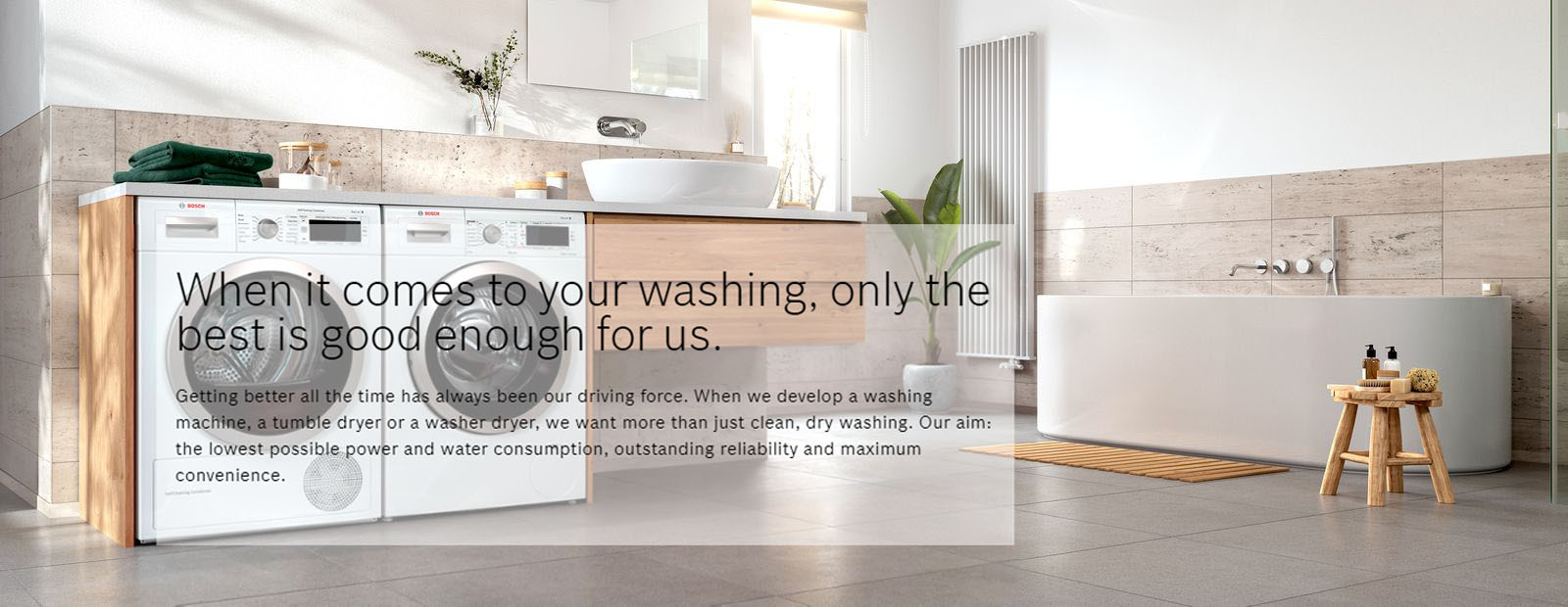 With Bosch, integrated solutions are always a smart option, never a compromise: our washer dryers not only wash flawlessly clean, they also dry perfectly and quickly, all in one solid appliance. This makes them the ideal choice for all those who value high performance and efficiency but lack space.